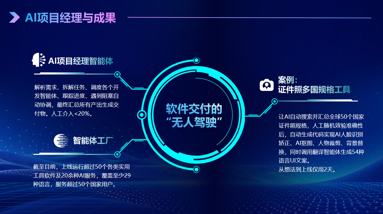 董事长付福前分享了六角星科技在AI编程领域的实践成果。他举例称,团队曾用AI在2天内完成从全球50个国家证件照规格调研、AI人脸识别功能开发到54种语言UI文案生成的全流程,效率提升超200%。