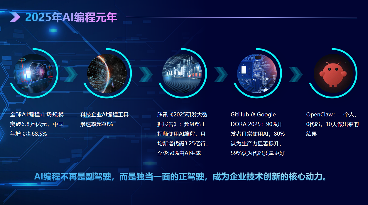 在报告中,董事长付福前指出,2025年已成为“AI编程元年”,全球AI编程市场规模突破6.8万亿元,中国企业AI编程工具渗透率已超40%。他以腾讯《2025研发大数据报告》为例,指出超90%的工程师已使用AI编程,月均新增代码中至少50%由AI生成,AI正从“辅助编码”逐步走向“独立承担开发任务”的核心位置。