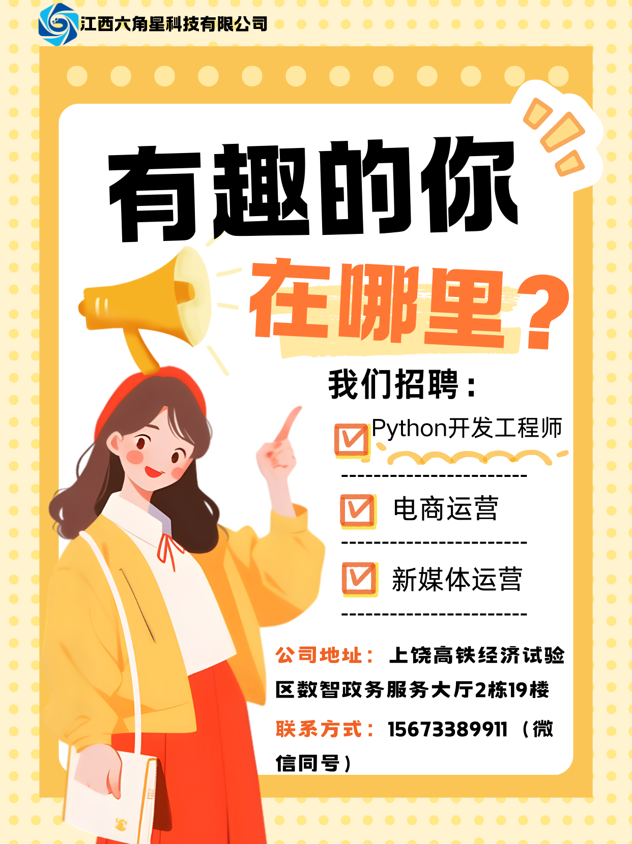 公司名称:江西六角星科技有限公司 公司地址:上饶高铁经济试验区数智政务服务大厅2栋19楼联系方式:15673389911(微信同号)